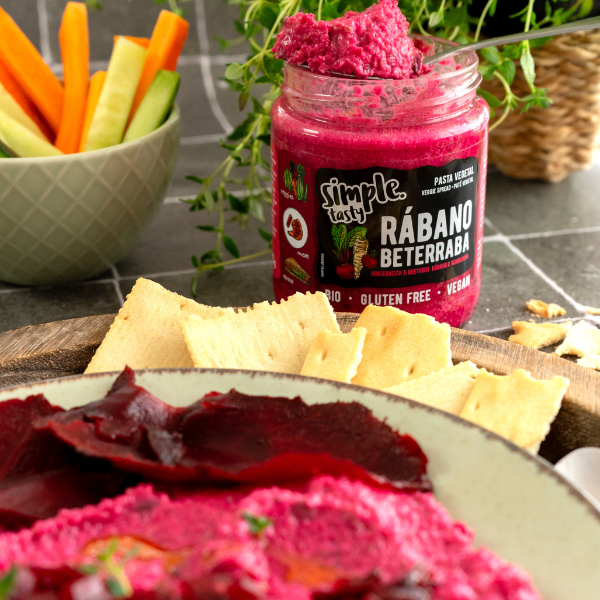 Pasta de Vegetais A Pasta Vegetal Rábano e Beterraba Simple® Tasty é uma deliciosa combinação de sabores que dá um toque especial a qualquer refeição. Com ingredientes naturais de origem biológica, é ideal para acompanhar com carne, para dar mais sabor às saladas ou barrar no pão.