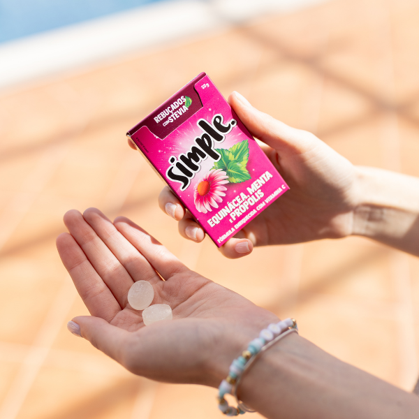 Rebuçados sem açúcar, adoçados com stevia e enriquecidos com vitamina C. Os Rebuçados Simple são uma deliciosa mistura de extratos de frutos e plantas com propriedades eficazes que auxiliam na sensação de garganta irritada. Um momento doce e refrescante, sem adição de açúcar, com as ações da equinácea e a frescura da menta.