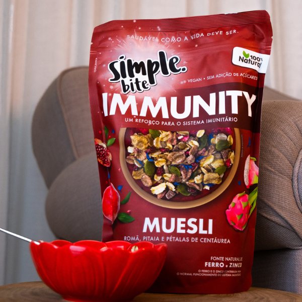 Cereais de Aveia e Trigo, com Damasco, Romã, Sementes de Girassol e Abóbora. O Muesli Immunity Simple Bite é um reforço para as suas defesas. Uma combinação de ingredientes tropicais que mistura cereais integrais com saborosas frutas como a romã, pitaia e damasco, e ainda com texturas crocantes de sementes e pétalas de centáurea secas.Contém Ferro e Zinco que contribuem para o normal funcionamento do sistema imunitário. Muesli Immunity Simple® Bite fornece, por 100 g, a quantidade significativa da dose diária recomendada para se produzirem os efeitos benéficos alegados para o Ferro e Zinco.